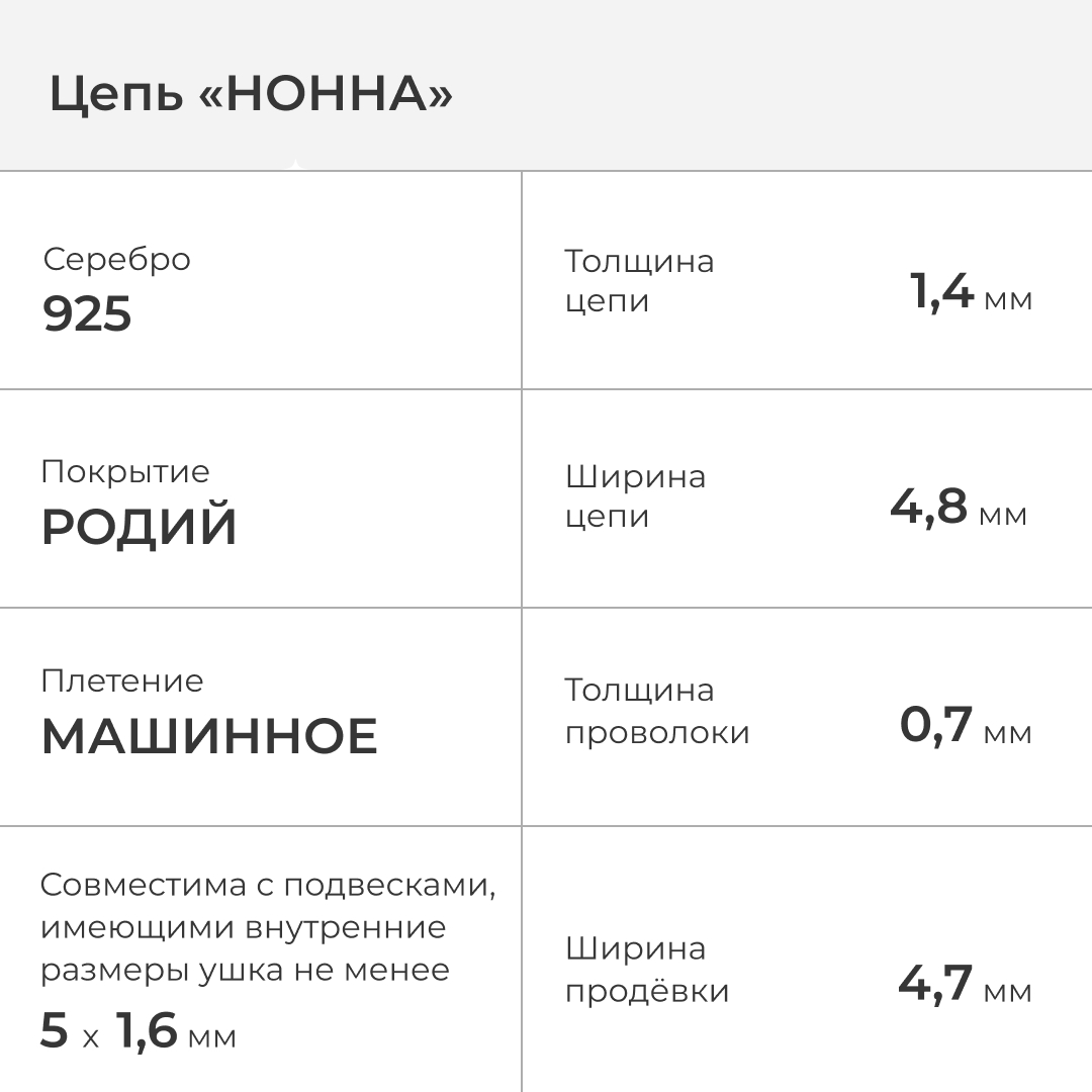 Цепи машинного плетения "Нонна", несомненно, имеют свою индивидуальность. Это выражается в наличии двойных звеньев, что придаёт изделию не только особую изящность, но и надёжность. Звенья такого плетения немного отшлифованы с обеих сторон, что позволяет быть изделию более плоским.